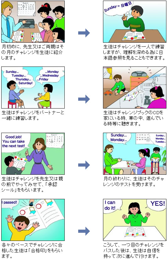 「私がチャレンジブックとTEMI(NPO法人英語教授法研究会)を大好きな理由をもうひとつ。 先日9歳の女の子がお母様と一緒に私の英会話レッスンを見学に来ました。 彼女は3歳の時から大手英会話学校に通っているにもかかわらず、アルファベットもきちんと言えず、1年生のチャレンジも全くできない状態でお母様はがっかりされていました。私の60分の体験レッスンを見てお母様は大喜びでした。子どもさんは辞書を引いて単語を調べる練習や、ポスターを見ながらの言葉の練習をしたあと、チャレンジブックのCDを聞くと、しっかりと英語で自己紹介をしたのです。お母様は感激してその場で入会を即決されました。Thank you very much!」